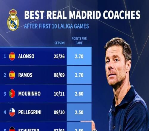 北京时间10月26日,西甲联赛第10轮,皇马在主场2-1战胜巴萨。据统计数据显示,在执教皇马的前10场西甲比赛中,阿隆...
