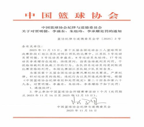 根据公告,2025年11月13日,第十五届全国运动会三人篮球项目决赛阶段C组江苏队对阵江西队的比赛中,江苏队3号运动员贾明儒、5号运动员李盛东、8号运动员朱松玮、17号运动员李承耀存在连续、持续质问、指责临场裁判员判罚,干扰临场裁判员执裁工作的行为,全队四名运动员均受到取消比赛资格的判罚,本场比赛因江苏队缺少队员而告负。为落实第十五届全国运动会赛风赛纪相关要求,严肃纪律,针对运动员的违规、违纪行为以及所造成的影响,根据《中国篮球协会纪律准则和处罚规定》第二十四条和第六十九条,对贾明儒、李盛东、朱松玮、李承耀给予如下处罚:1、通报批评;2、停止参加中国篮球协会所辖赛事活动1个月(处罚期从2025年11月16日至2025年12月15日)。