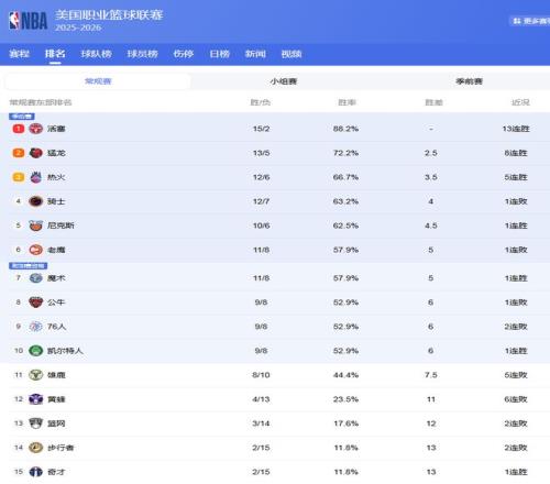 热火同样是黑马,12胜6负位列东部第3,球队进攻火力惊人,场均得分高居联盟第1,斯波的调教确实非常到位,他们也是东部本赛季的一大搅局者!