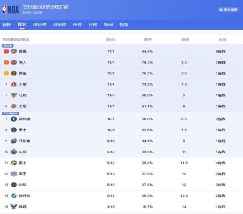 在3队之后,马刺11胜5负排名第5,文班的受伤,让他实力有所下滑。太阳本赛季复苏,以11胜7负位列西部第6位,森林狼10胜7负排名第7,可他们表现却开始下滑,尤其是面对强队缺少竞争力!勇士10胜9负排名第8,开拓者位列第9,而快船已经掉到西部倒数第3!