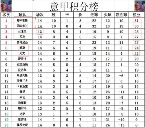 积分榜方面,那不勒斯绝杀尤文拿下3分,他们就再超过国米1分,先赛的情况下超过AC米兰3分登顶成功。罗马遭遇连败,无力再回前3,还是差AC米兰1分排在第4。输球的尤文则是1分之差,还是排在黑马科莫之后位列第7。